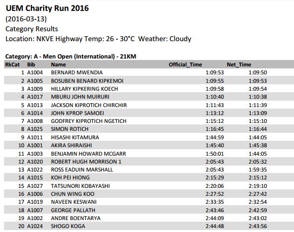 Penonton Uem Charity Run 2016 Top 20 Results